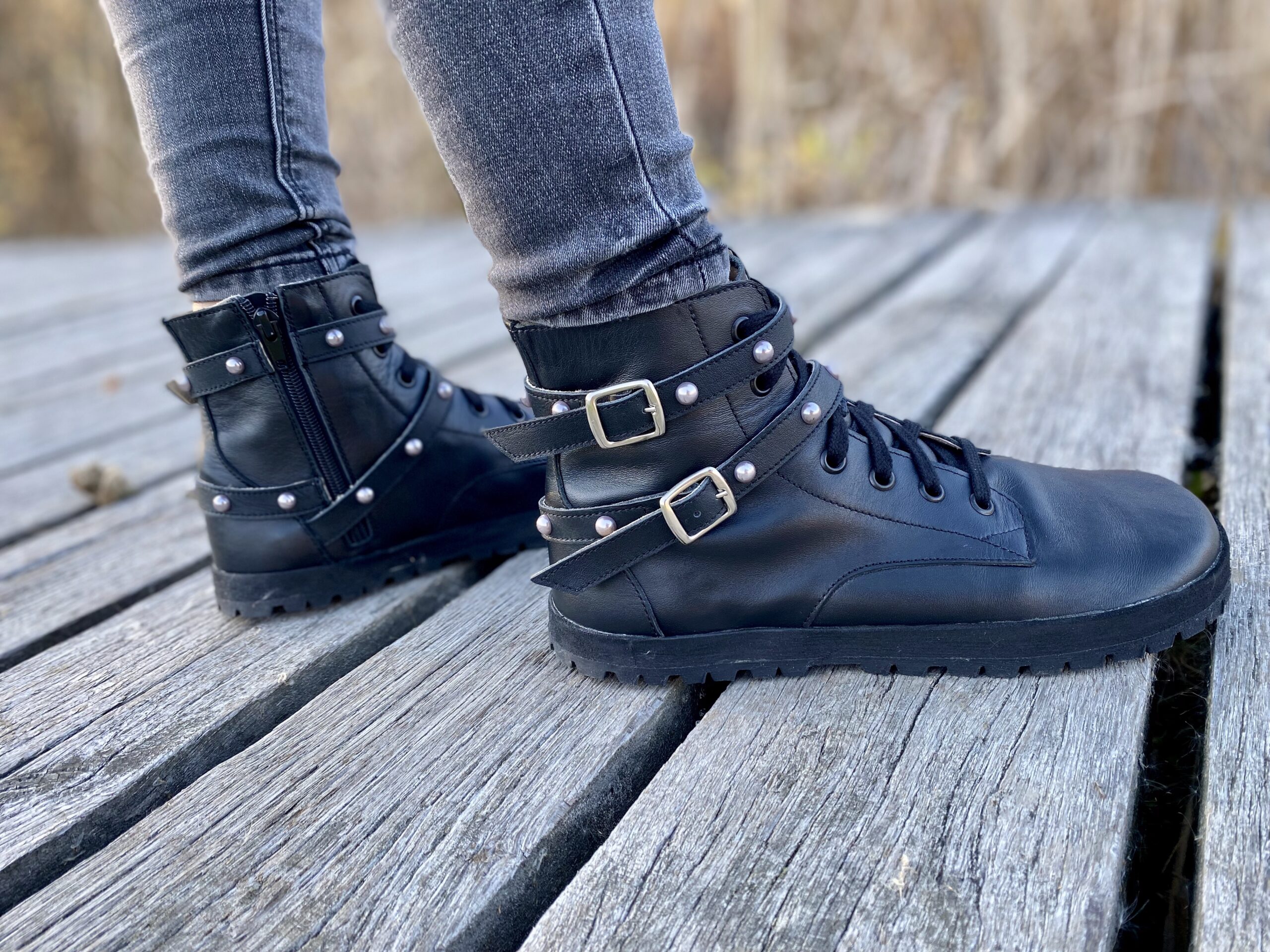 Pásky s jemnými perličkami a kovovými přezkami dodávají botám osobitý vzhled – ženský, ale silný.